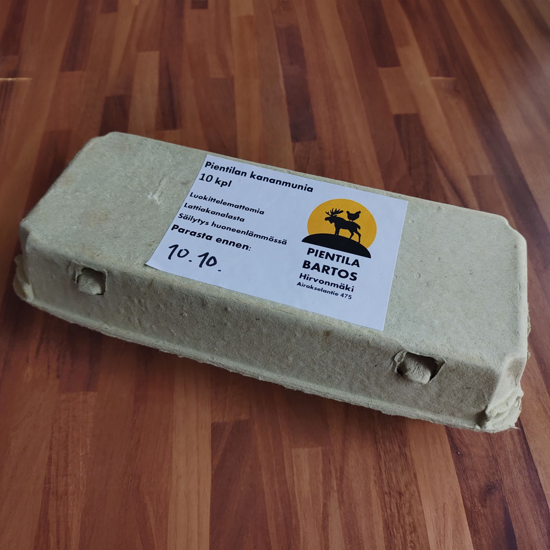 Kananmunia pihamme sekalaisesta kanaparvesta. Kanamme ovat terveitä maatiaiskanoja, appenzellereitä ja sekarotuisia. Ne saavat ulkoilla lumettomaan aikaan lintuinfluenssarajoitukset täyttävässä häkissä.