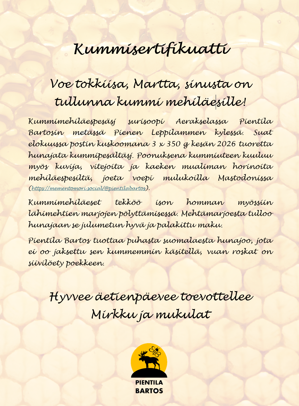Kummimehiläispesä on hieno ja omaperäinen lahja, ja siitä on iloa myös antajalle. Pakettiin kuuluu kummitodistus, somesisältöä ja syksyllä tuoretta hunajaa.