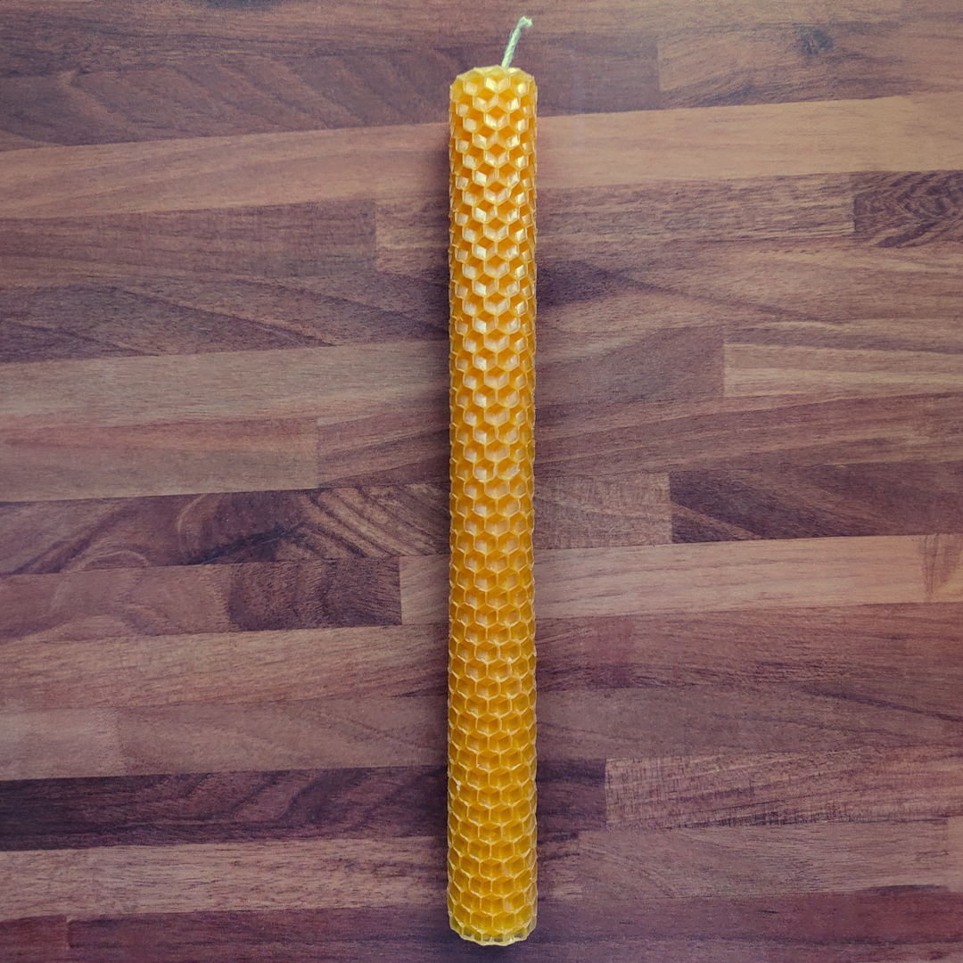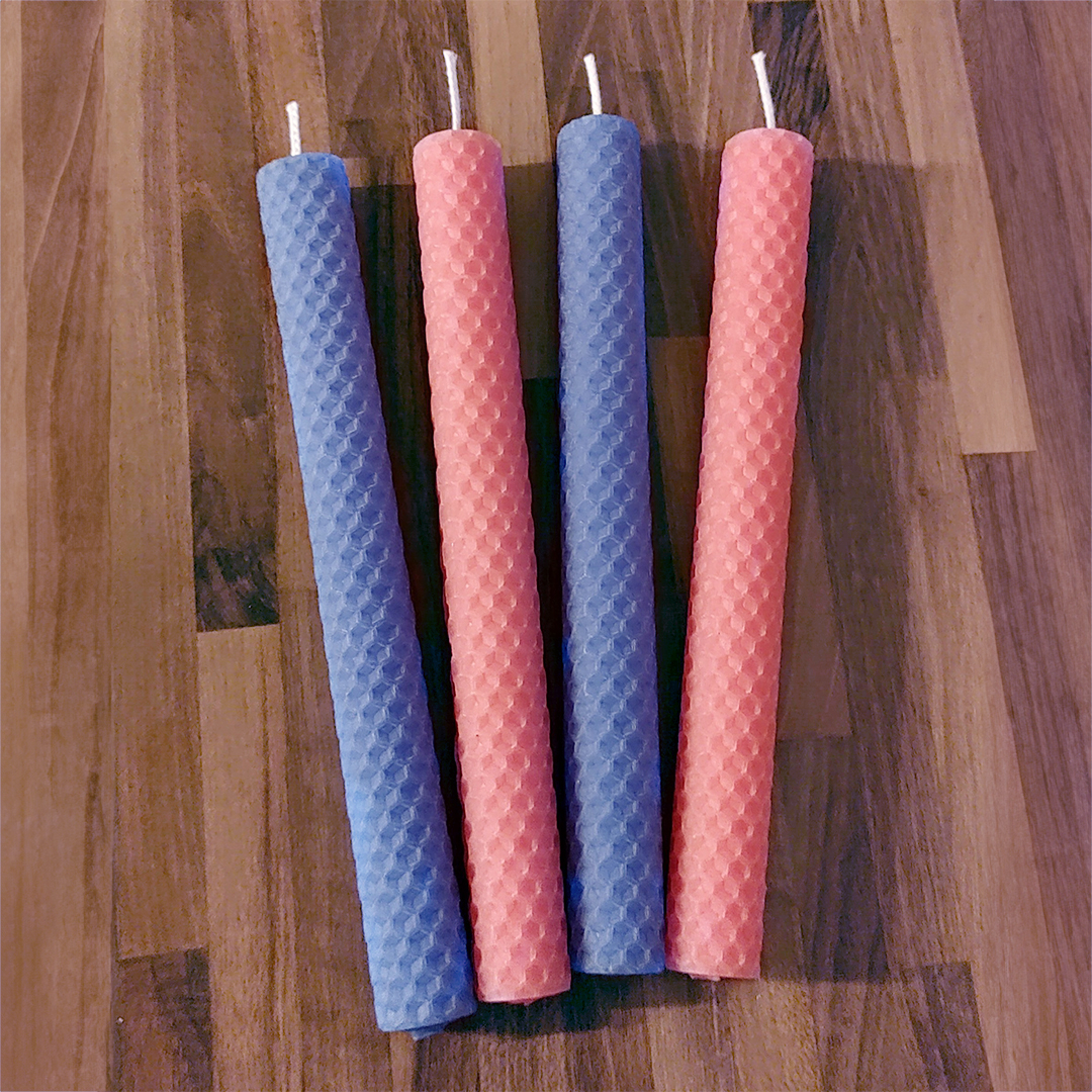 Pitkä mehiläisvahalevystä pyöritetty kynttilä. Saatavana vaaleansinisenä, vaaleanpunaisena, mustana ja keltaisena.